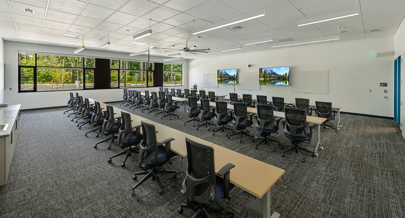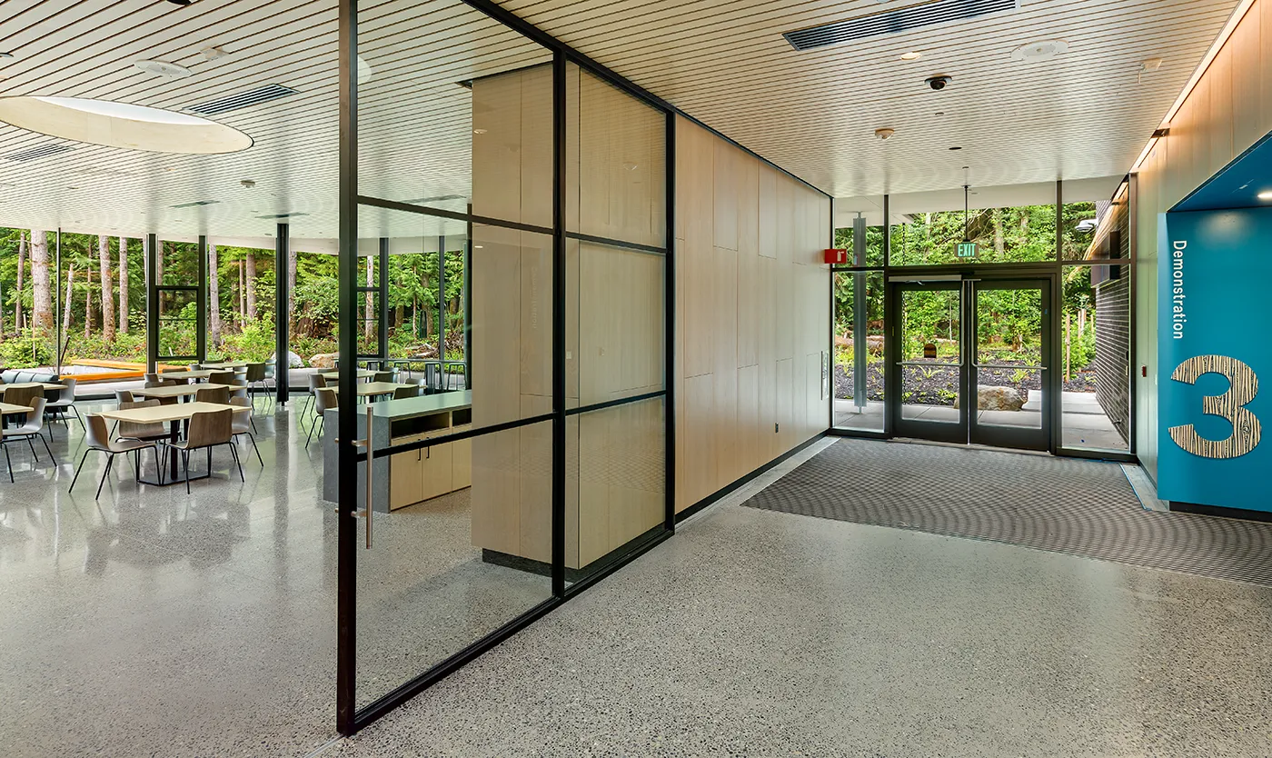 Architecturally, the project was designed as a high-performance public building that integrates with its wooded Tumwater site. Large windows, skylights, and solar tubes bring daylight into laboratories and office areas, while interior materials such as polished concrete floors and wood ceilings create a clean, restrained aesthetic. The project was also built with sustainability goals in mind and is designed to operate as a net-zero-energy facility once its photovoltaic system is fully installed.